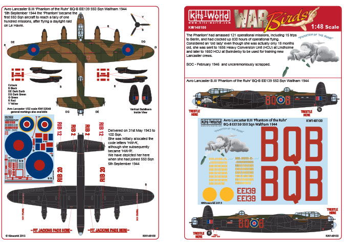 このセットでは1944年ウォルサムにおけるイギリス空軍第100飛行隊所属の爆撃機、アブロランカスターBIIIのEE139に描かれたマーキングを収録。「ファントム・オブ・ザ・ルール」のニックネームにちなんだ幽霊のノーズアートをはじめ、出撃回数を記したマークなどもセット。ルール地方やベルリン空襲に活躍した機体を再現していただけます。イギリス機ファンには見逃せないデカールです。