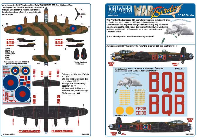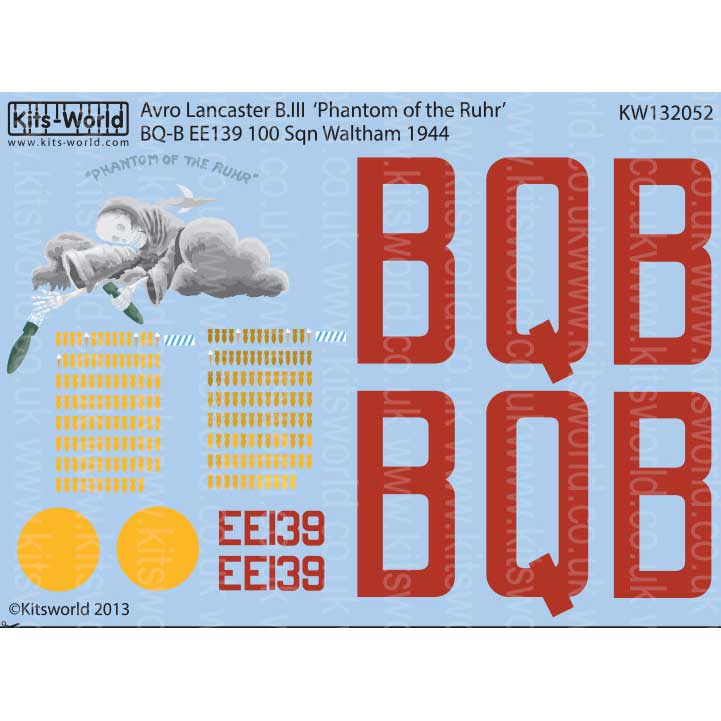 このセットは第二次世界大戦のイギリス空軍で第100飛行隊に配備され、100回以上の出撃を記録したランカスターのEE-139「ファントム・オブ・ザ・ルール」のマークを収録。ノーズアートのイラストはもちろんしっかりと再現。イギリス機ファン、RAFファンには見逃せないデカールセットです。