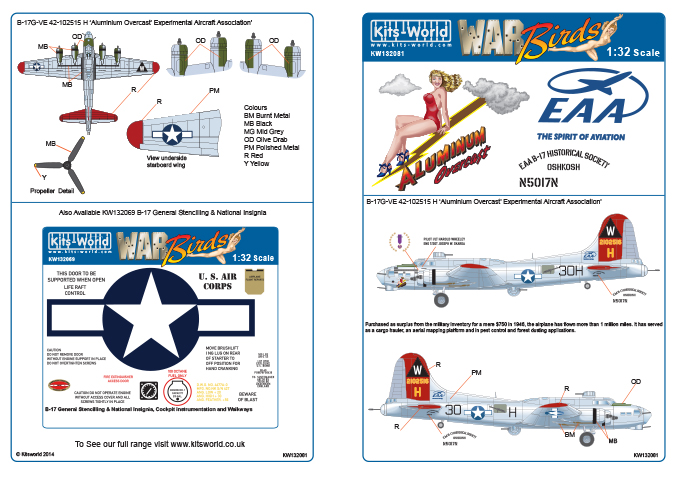 このセットは第二次世界大戦後にEAA(エクスペリメンタル航空協会)がレストアし、飛行可能な状態で保存、運用している有名なB-17「アルミニューム・オーバーキャスト」号のマーキングを収録しています。ピンナップガールのノーズアートや対戦中の活躍を示す出撃マーク、EAAのマークなども再現。B-17ファンには注目のデカールセットです。デカール印刷は高品質で定評あるイタリアのカルトグラフ社です。