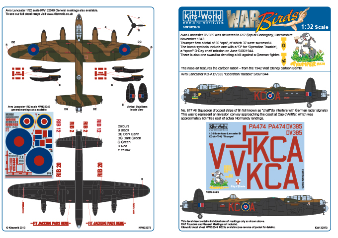 このセットでは1944年RAFウッドホールにおけるイギリス空軍第617飛行隊所属の爆撃機、アブロランカスターBIに描かれたマーキングを収録。ディズニーアニメ、バンビに出てくるウサギのキャラクター「サンパー」を描いたノーズアートが魅力です。イギリス機ファンには見逃せないデカールです。