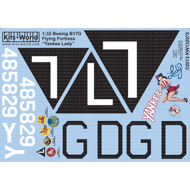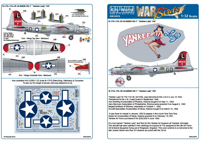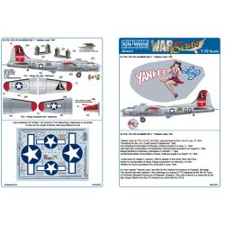 このセットはアメリカで飛行可能状態で保存されている「ヤンキー・レディ」号のマーキングを収録。ピンナップガールを描いたノーズアートはもちろん、尾翼のテールコードなどのマークも再現しました。第二次大戦末期の1945年7月にデリバリーされ、大戦後の1946年に沿岸警備隊に譲渡されました。退役後は民間に払い下げられ、1969年には映画「トラ、トラ、トラ」でも撮影に使用された機体です。カラフルなマーキングはB-17ファンには見逃せません。