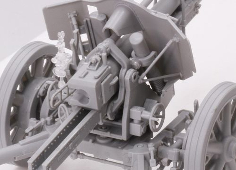 野戦榴弾砲ならではのメカニカルな魅力を細部までの細かな再現で楽しんでいただけます。砲身は一体成型でマズルブレーキは別パーツでセット。
