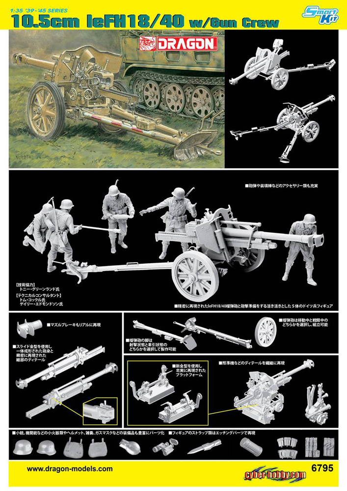 第二次世界大戦でドイツ軍が装備した10.5cm野戦榴弾砲leFH18/40を1/35スケールで再現したプラスチックモデル組み立てキットです。