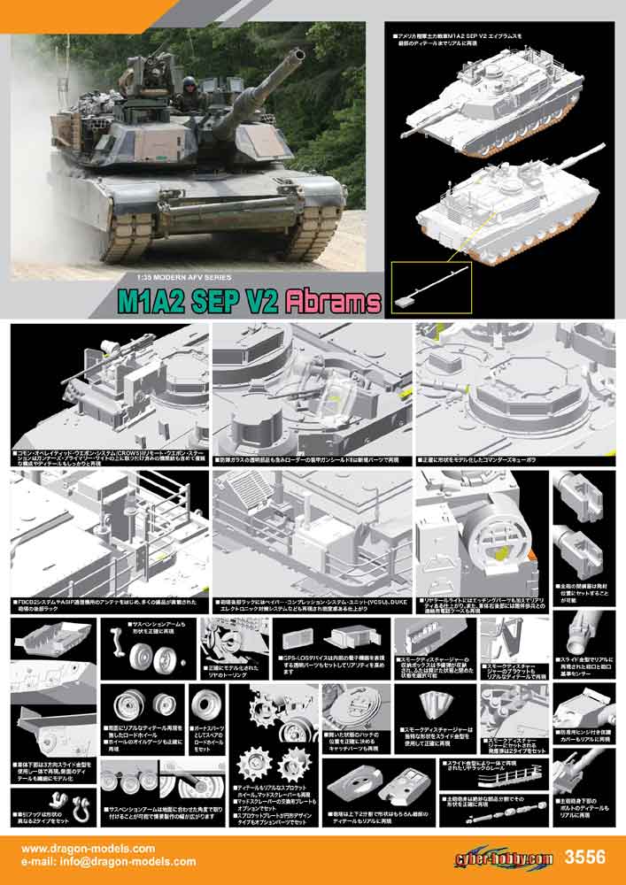 アメリカ軍現用主力戦車M1エイブラムスの最新バージョン、M1A2エイブラムスSEP V2を1/35スケールで再現したプラスチックモデル組み立てキットです。