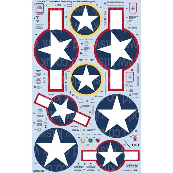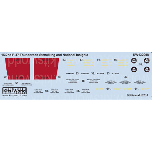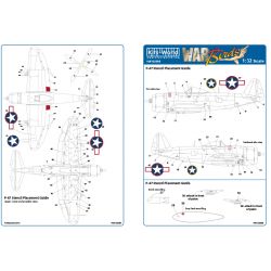 このセットではP-47Dサンダーボルトに描かれたアメリカ軍の国籍マークなどを再現しています。スターズ&バー、ラウンデルマークのほか機体各部に描かれた細かな注意書きなどもセット。1/32P-47Dの各社モデルに幅広く使っていただけます。モデルのディテールアップなど、見逃せません。