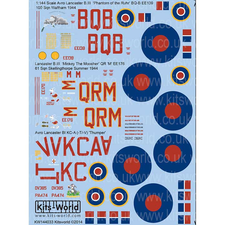 このセットでは1944年ウォルサムにおけるイギリス空軍第100飛行隊所属の爆撃機、アブロランカスターBIIIのEE139に描かれたマーキング、1944年RAFウッドホールにおけるイギリス空軍第617飛行隊所属の爆撃機、アブロランカスターBIに描かれたマーキング、そして1944年ボーンにおけるイギリス空軍第97飛行隊所属の爆撃機、アブロランカスターBIIIのEE176に描かれたマーキングを収録。