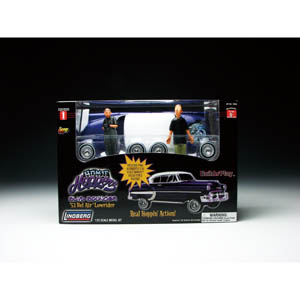 モデルはホッピングの動きが楽しめるメカニズムと動きを操作するコントローラーをセット。もちろん、シボレー・ベルエアの初代モデル、1953年型の重量感あるスタイルをリアルにモデル化。ボディパーツはメタリックの入ったパープルとルーフは白に塗り分けられ、サイドのモールなどはシルバーに塗装済み。トランクには派手なイラストのマークも張り込み済みです。さらにホワイトリボンのタイヤにスポークホイールも組み立て済みです。手軽に組み立ててホッピングアクションをお楽しみいただけるモデルです。