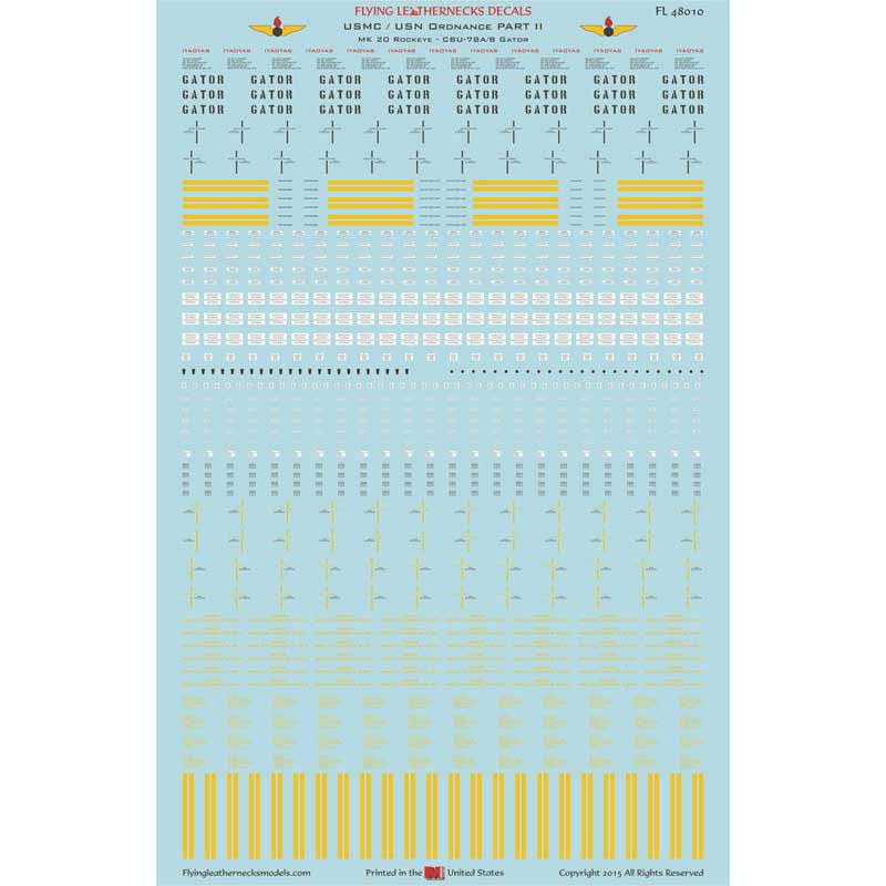 このセットではアメリカ海兵隊、アメリカ海軍が運用するクラスター爆弾、対装甲クラスター爆弾MK-20ロックアイとCBU-78ゲイター地雷ディスペンサーの爆弾本体の表面に各種描かれている注意書きの文字やライン、マークなどを再現しています。
