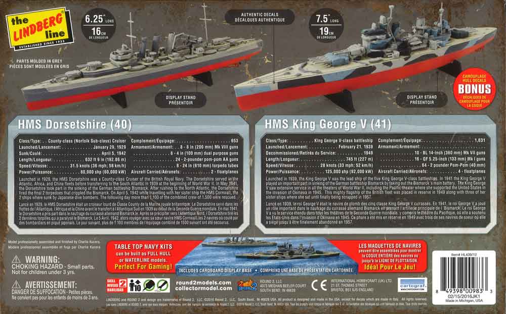 LINDBERG 1/1200 TABLE TOP NAVY HMS DORSETSHIRE & HMS KING GEORGE V 2-PACK