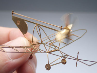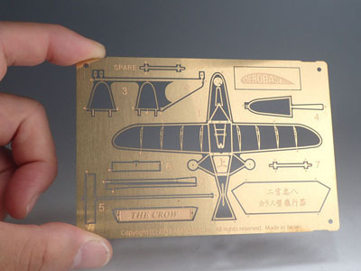 モデルは江戸から明治にかけて飛行原理に着目した初の日本人として知られる、二宮忠八が作ったカラス型飛行器を再現しています。二宮忠八は慶応2年に現在の和歌山県八幡浜市矢野町に生まれ、明治22年にカラスの滑空する様子から羽ばたくことなく空を飛ぶことが可能ではないかとの飛行原理を発見。翌年にカラス型模型飛行器と呼ばれる模型を制作して約10m飛行させてといわれています。ライト兄弟が有人飛行に成功する14年も前のことでした。その忠八が航空界の安全と航空殉職者の慰霊を目的として建立した二宮飛行神社の資料館に展示されているカラス型飛行器の模型を1/5スケールで再現。真鍮製のエッチングパーツで構成され、接着剤なしで組み立てられるキットです。完成時のウイングスパンは90mm。繊細な骨組みと形状をしっかりとモデル化。機首部分の顔のところに再現される目はシールでセットされています。ほかに、アクリル製のディスプレイベースもセット。日本の偉人の足跡を手にするキットです。