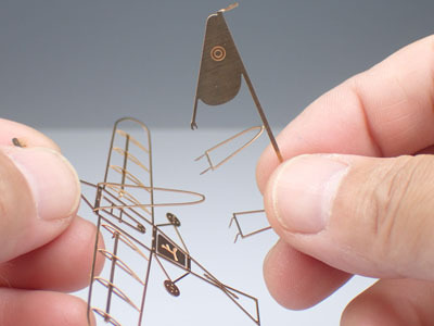 組み立てはエッチングパーツをカッターナイフで切り取ってはめ込んだり、金属の特性を利用して曲げたりすることで組み立てられます。接着剤なしで組み立て可能です。少しこつを掴めば手軽に楽しんでいただけることでしょう。