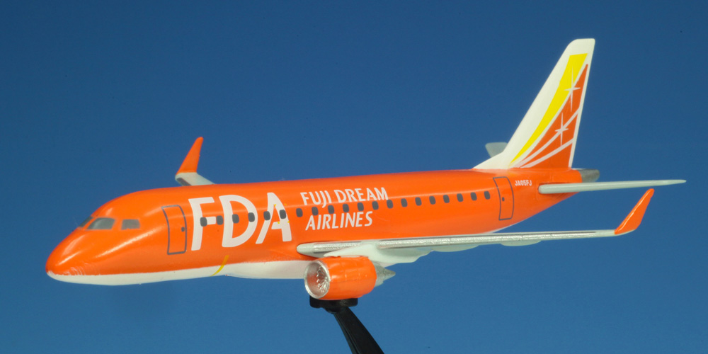 富士山静岡空港と名古屋の小牧空港を拠点に日本各地を結ぶエアライン、フジドリームエアラインズが運用するオレンジ塗装の5号機を1/300スケールで再現した塗装済み、半完成飛行機模型組み立てキットです。