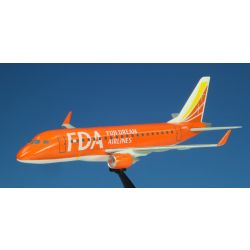 モデルはFDA、フジドリームエアラインズが運用するエンブラエル170/175を1/300スケールで再現しています。全長は約10cmできれいな機体形状を実感たっぷりにモデル化。各パーツは塗装済みで、パーツ数も少なく、どなたでも簡単に完成させていただけます。このモデルはFDAが導入した5号機のオレンジの機体色で仕上げられています。明るいオレンジが静岡のみかんも連想させる仕上がりです。エンジンポッドは機体と同じオレンジ、主翼はグレイで前縁部分はシルバーで塗り分け。機体色とのコントラストもきれいな機体です。また、胴体に描かれたFDAのロゴなどはもちろん再現済み。飛行状態でディスプレイできるスタンドもセットされています。そのまま机上にディスプレイしたり、また、機体ごとに異なるカラーリングのFDAのエンブラエルの各色モデルも揃っていますから、並べてみたり、FDAを利用する機会があれば搭乗した機体のカラーのモデルを記念に飾っておくのも良いでしょう。