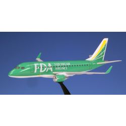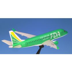 モデルはFDA、フジドリームエアラインズが運用するエンブラエル170/175を1/300スケールで再現しています。全長は約10cmできれいな機体形状を実感たっぷりにモデル化。各パーツは塗装済みで、パーツ数も少なく、どなたでも簡単に完成させていただけます。このモデルはFDAが導入した11号機のグリーンの機体色で仕上げられています。明るいグリーンが爽やかな印象を与える仕上がりです。エンジンポッドは機体と同じグリーン、主翼はグレイで前縁部分はシルバーで塗り分け。また、胴体に描かれたFDAのロゴなどはもちろん再現済み。飛行状態でディスプレイできるスタンドもセットされています。そのまま机上にディスプレイしたり、また、機体ごとに異なるカラーリングのFDAのエンブラエルの各色モデルも揃っていますから、並べてみたり、FDAを利用する機会があれば搭乗した機体のカラーのモデルを記念に飾っておくのも良いでしょう。