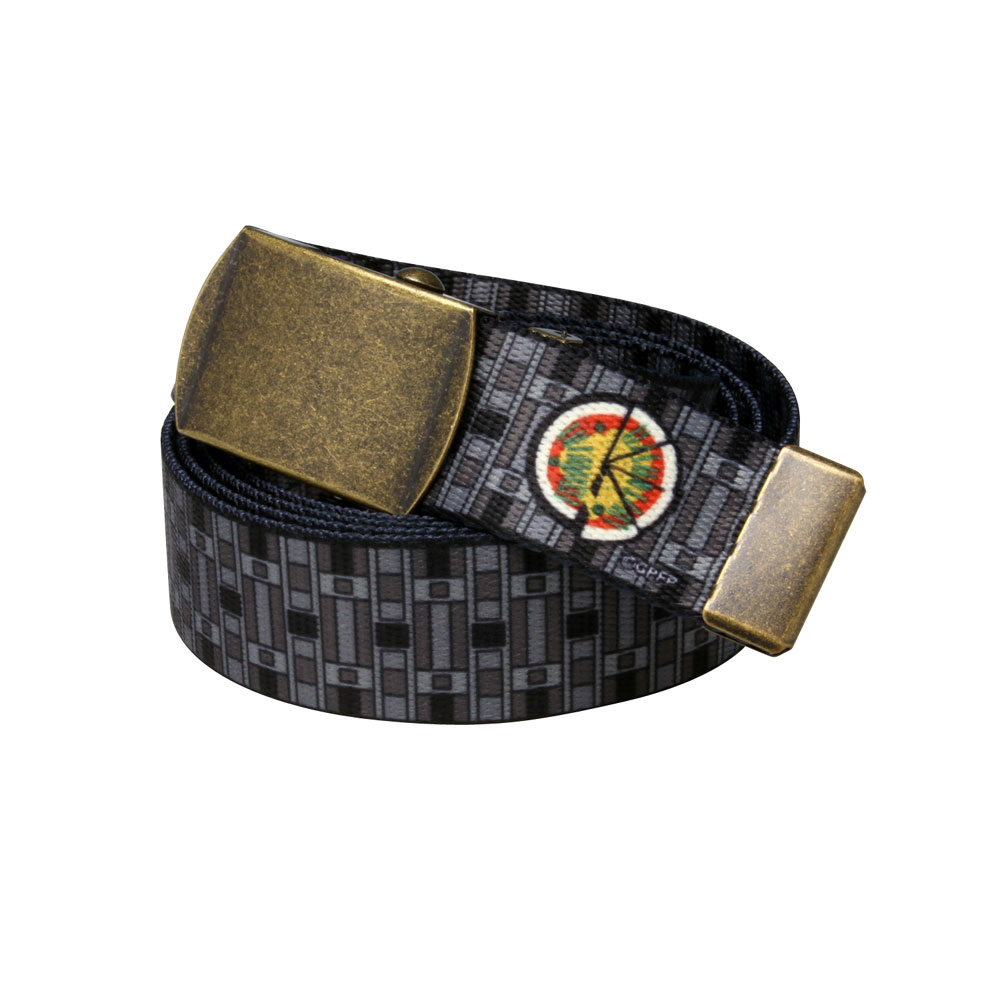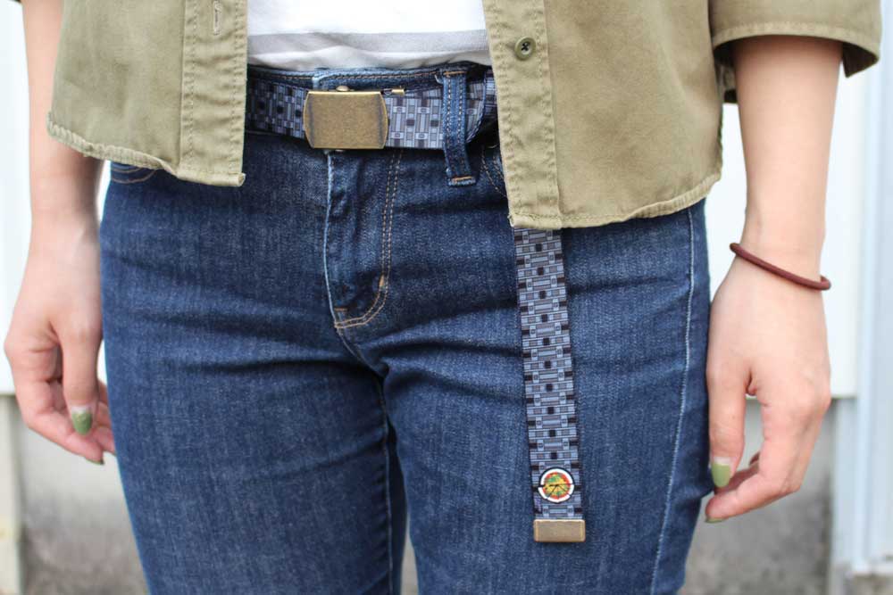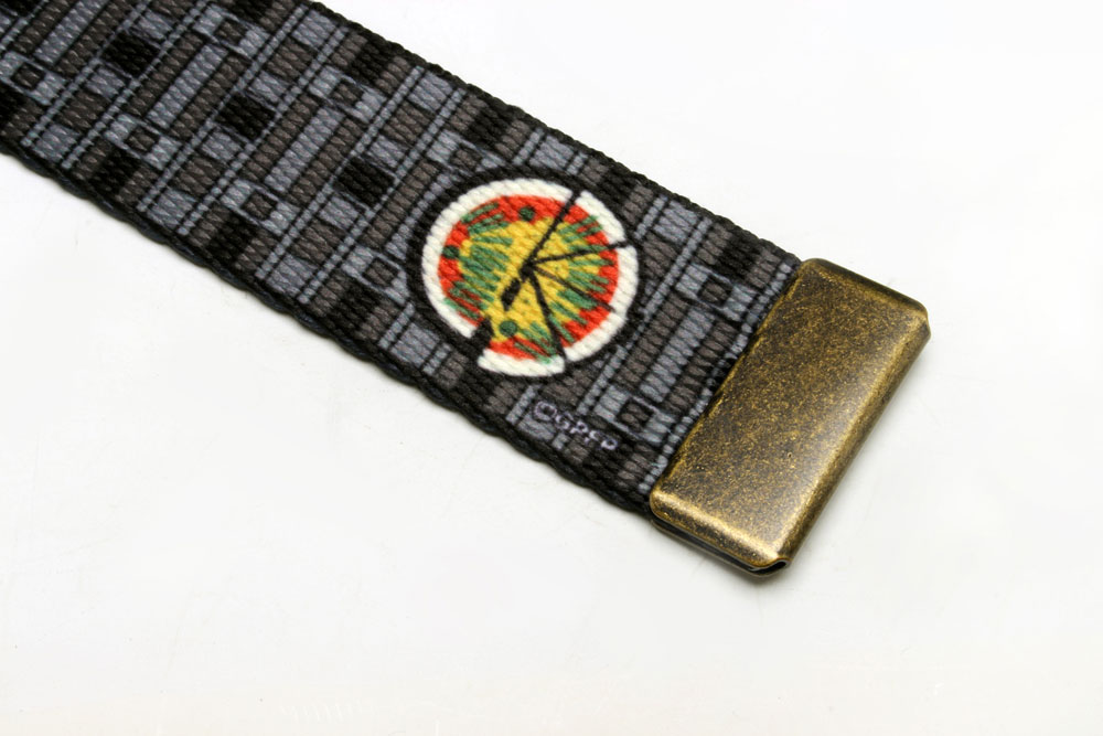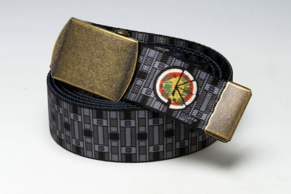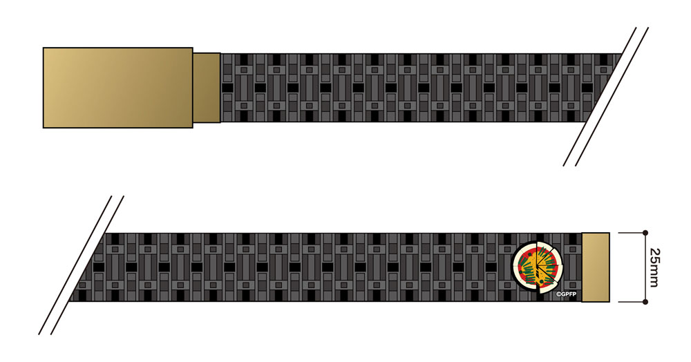 片面のベルトの端にはワンポイントでアンツィオ高校の校章をあしらったシンプルなデザインで、普段使いにも最適!両面に履帯のデザインをプリントしてあるので、バックルを外して表裏を変えれば、端までシンプルなデザインでお楽しみいただけます。
