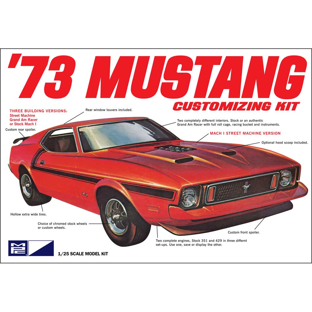 モデルは1973年型のフォード・マスタングを1/25スケールで再現。ハイパフォーマンスモデルとして人気を集めたマッハ1タイプをモデル化しています。
