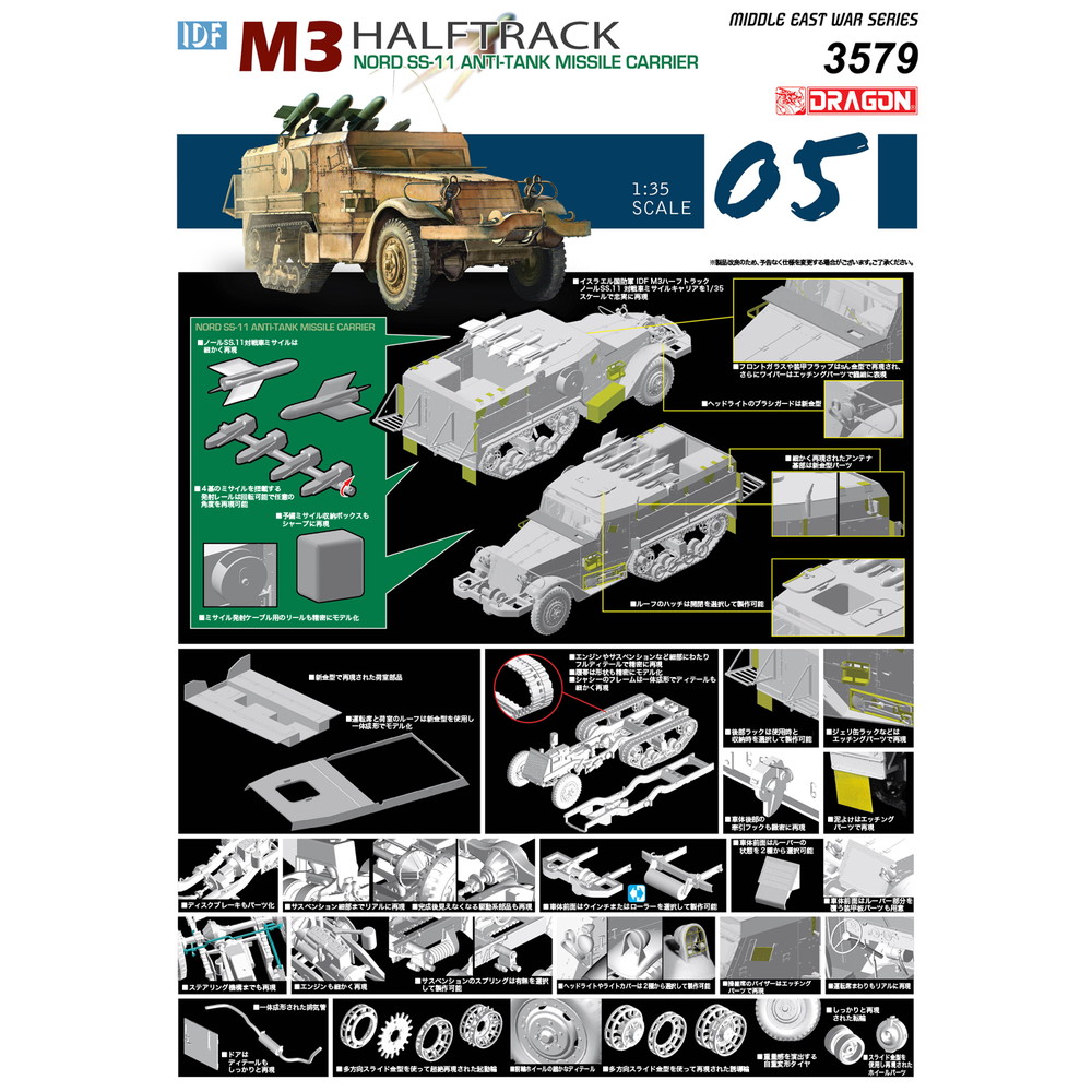 すでに発売されて好評のイスラエル国防軍仕様M3ハーフトラックをベースに新規パーツを追加。車両のキャリア部分に装備されたノールSS.11対戦車ミサイル4基と発射レール、さらに、予備ミサイル収納ボックスなどを正確にモデル化。このモデルの大きな見どころです。