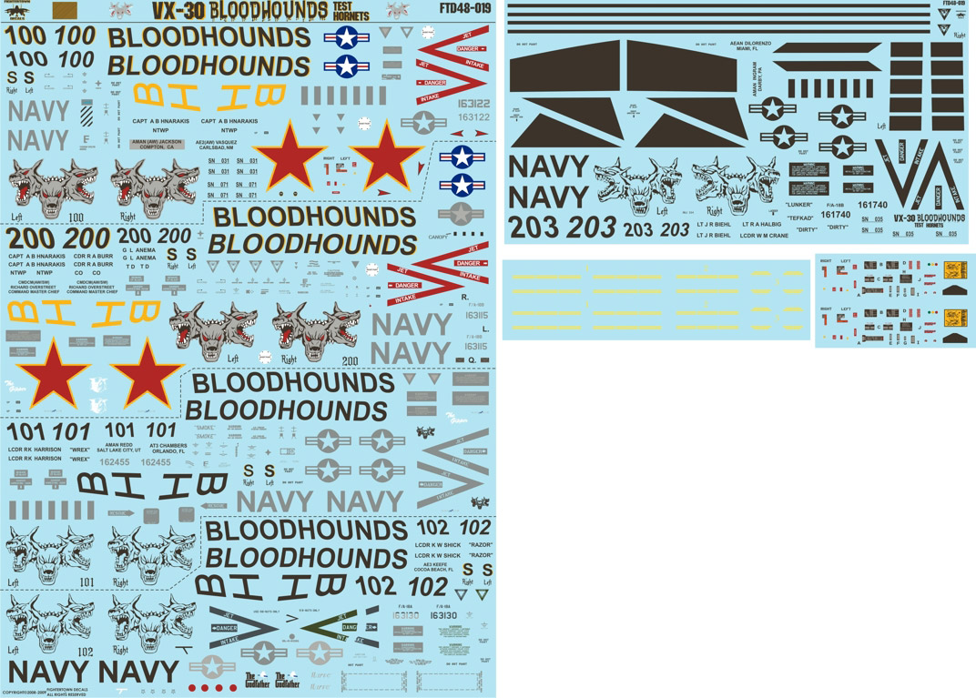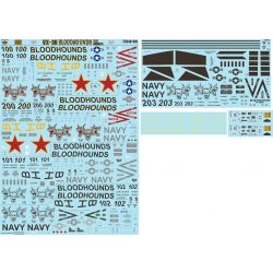 このセットはアメリカ海軍の航空兵器試験評価部隊、VX-30飛行隊に所属するF/A-18A/Bレガシー・ホーネットのマーキングを収録。ブラッドハウンズのニックネームを持つ部隊の尾翼に描かれた特徴ある三頭犬ケルベロスのマークはもちろん、アドバーサリー機ならではの赤い星のマークなどに加えて、脚やシートの注意書きなどの細かなマークもセット。迷彩カラーの詳細な塗り分け指示も入っています。 ホーネットファンには見逃せないデカールセットです。