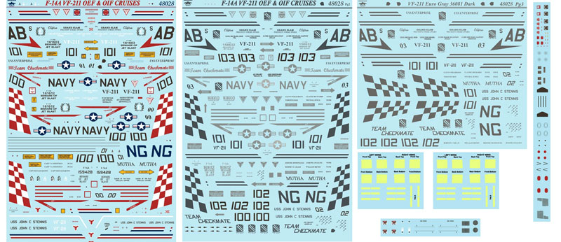 このセットは2001年からアフガニスタンで行われた「不朽の自由作戦(OEF)」と2003年からイラクで展開された「イラクの自由作戦(OIF)」に参加したVF-211飛行隊所属機のマーキングを収録。特徴ある尾翼のチェッカー模様をはじめ、国籍マークや出撃マークなども細かく再現しました。
