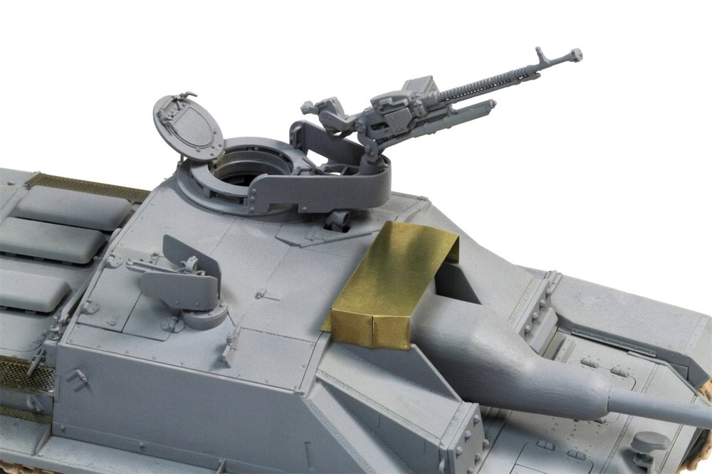 シリア軍が独自に改修を行ったキューポラ上の機関銃シールドやマウント、雑具箱なども新金型パーツでしっかりと再現。主砲防盾上部に取り付けられたカバーもエッチングパーツでセットされ、特徴的ある仕上がり。