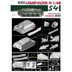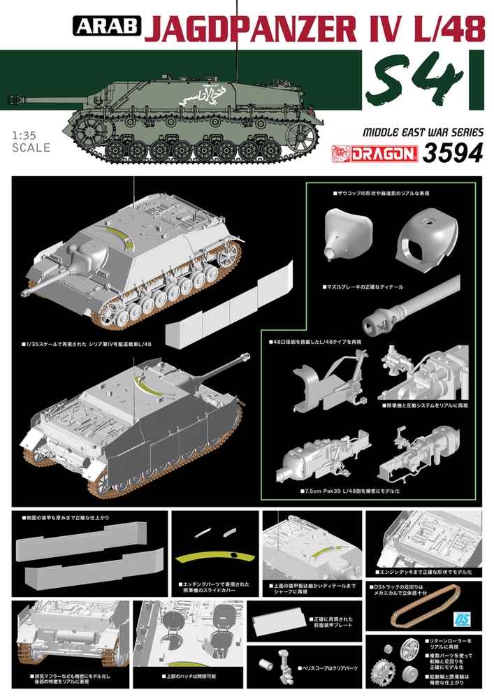 モデルは1/35スケールでシリア軍が配備運用したIV号駆逐戦車を再現したプラスチックモデル組み立てキットです。48口径砲を搭載したL/48タイプを再現しています。 ドラゴンが六日間戦争50周年に合わせて精力的に開発を進める中東戦争モデルの1台で、今回限りの限定生産キットです。 低く構えたシャープなシルエットをはじめ、装甲板の溶接跡や主砲防盾、ザウコップの形状や鋳造肌のリアルな表現、マズルブレーキの正確なディテールも見逃せません。 すでにラインアップされているドラゴンのIV号駆逐戦車モデルと同様、定評ある仕上がりが楽しんでいただけます。 もちろん、マーキングはドイツ軍仕様とは趣を異にするアラビア文字を再現。独特な世界観が広がります。シャシー下面もサスペンションやロードホイールなど、足回りもメカニカルで立体感十分です。履帯には組立が手軽なベルト式のDSトラックを採用しています。 第二次大戦を終了後も存在感を発揮、ゴラン高原に奮戦した特別なIV号駆逐戦車はミリタリーファンのコレクションに欠かせません。