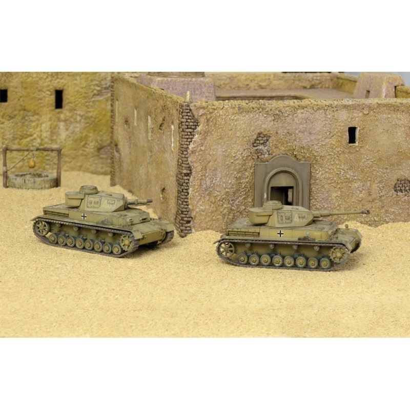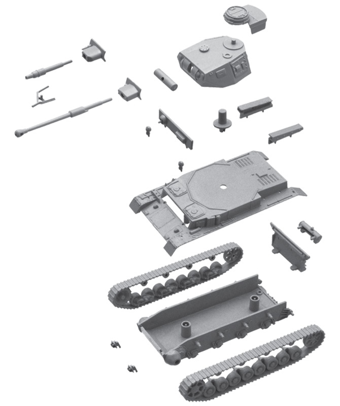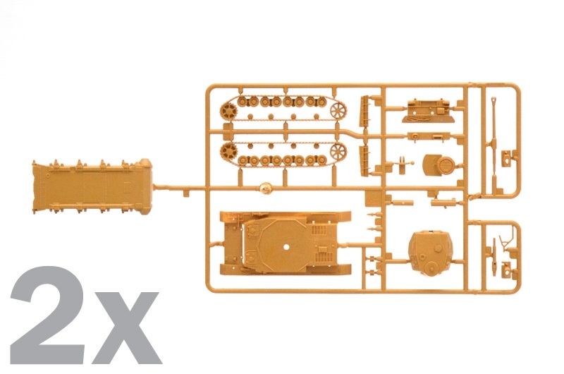 モデルはドイツ軍の軍馬と言われたIV号戦車を1/72スケールで再現したプラスチックモデル組み立てキットです。中でもF型をモデル化。短砲身の主砲を装備したF1型と長砲身の主砲を装備したF2型のどちらか選んで組み立てていただけます。また、キットは2輌分をセット。1輌分のパーツ点数は22点、仕上がりの全長は8.2cmです。2両分のパーツが入っていますからF1型、F2型を作り揃えてみるのも良いでしょう。部品点数を抑えた構成は一体成型のシャシー下部や転輪、サスペンション履帯までを一体成型部品とした足回りなどで組み立ては手軽。車体上部も一体パーツでフェンダー上の車載工具類も一体で表現。エンジンデッキのグリルやハッチ類のディテールもリアリティを高めます。マーキングはロシア戦線と北アフリカ戦線の2パターンを用意。ビギナーにも手軽に取り組んでいただけるキットです。