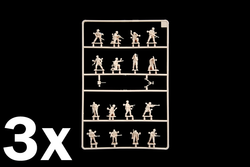 モデルは第二次大戦のドイツ軍降下猟兵の兵士を1/72スケールで再現したプラスチックモデルフィギュア組み立てキットです。セットのフィギュアは北アフリカ戦線で活躍した熱帯地仕様でモデル化。16ポーズ、48体。立ち姿勢、立膝姿勢の各ポーズでの射撃姿勢や偵察、あるいは指揮を執るポーズなどを再現。服装はどれも大戦中の降下猟兵の典型的な特徴あるスモックをユニフォーム姿を再現。肩から掛けた布製の弾薬入れもポケットなどのディテールまで、しっかりと表現されています。さらに、ヘルメットはもちろん、降下猟兵用のヘルメットを再現。兵装はKar98Kライフルをはじめ、MP40サブマシンガン、さらに、8cm迫撃砲34型なども再現されています。兵士の身長は約24.5mm。エリート部隊の勇姿が伝わるセットです。
