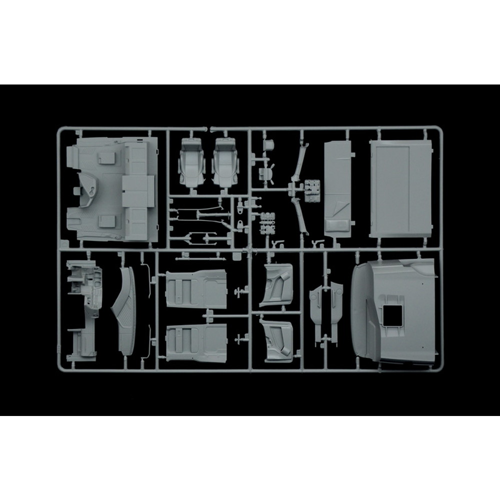 モデルは1/24スケールでドイツのメルセデス・ベンツがラインアップするトラック、アクトロスを再現したプラスチックモデル組み立てキットです。2012年に発売されたモデル、MP4のギガスペースキャビン装備タイプを再現しています。仕上がりの全長は約25.5cm、パーツ点数約350点。エンジンからシャシー、キャビン内部に至るまでフルディテールで再現しています。キャビンはハイルーフの外観はもちろんラジエターグリルのデザインなど、しっかりとモデル化。さらに、快適性が高い評価を集めた十分なスペースを持つギガスペースならではのインテリアもリアルに表現しています。キャブオーバータイプのキャビンは完成後も前方に開閉可能。その下には直列レイアウトのエンジンをターボチャージャーなどの補器類まで細かく再現しています。細かな塗装やディテールアップに腕を振るってみるのも楽しみです。加えてシャシーフレームも駆動系やサスペンションまで、実車のメカニズムをそのままモデル化。密度感あふれる仕上がりが見逃せません。マーキングはヨーロッパ各国のライセンスプレートなどもセットされています。
