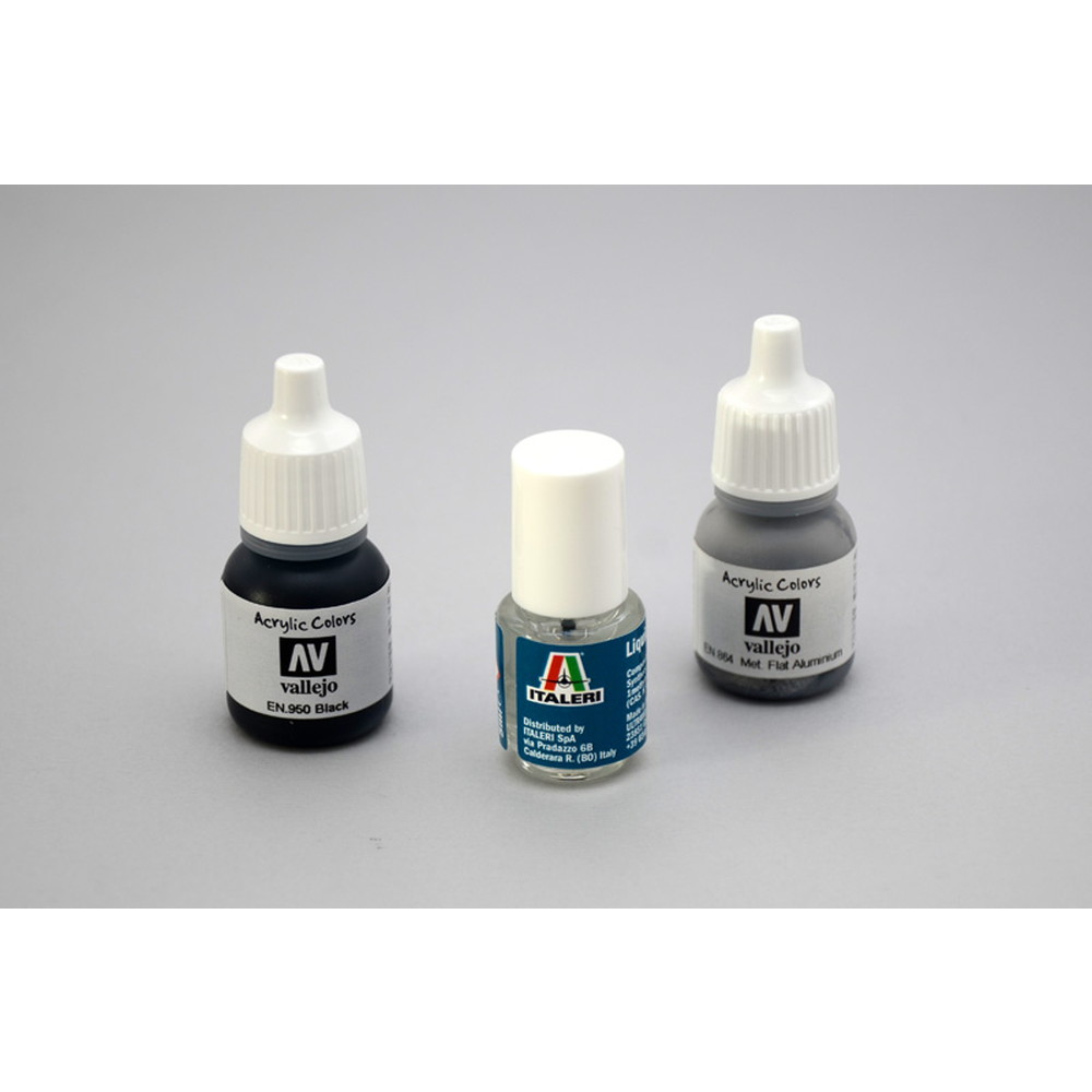 ■このキットには組み立てに必要な接着剤と基本カラーの塗料、筆、ニッパーがセット