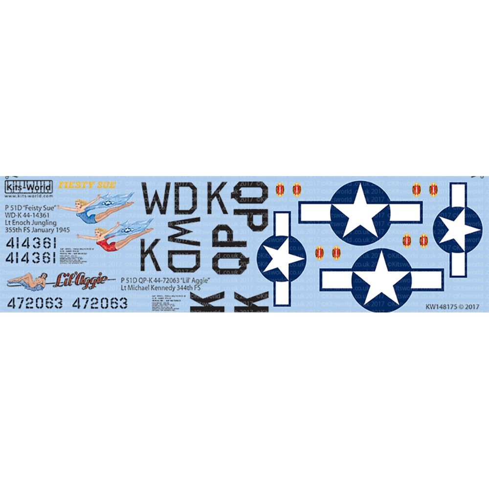 このセットではヨーロッパ戦線で爆撃機の護衛に活躍した第4ファイターグループに所属した機体と同じく第5ファイターグループの第334戦闘飛行隊に所属する機体の2つの機体のマーキングを収録しています。どちらも女性のイラストを描いたノーズアートなど、カラフルな仕上がりが楽しみなマークです。このセットはエアフィックスの1/48スケールキットに対応しています。