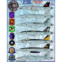 このセットでは専用のカラーリング、マーキングが施されて人気の航空団司令官搭乗機、CAG機と飛行隊長機、CO機から合わせて7機を選んでマーキングを収録しています。ハセガワの1/48スケール、スーパーホーネットのキットに対応し、このセットで2機分が製作可能なステンシルやデータのマークが用意されています。
