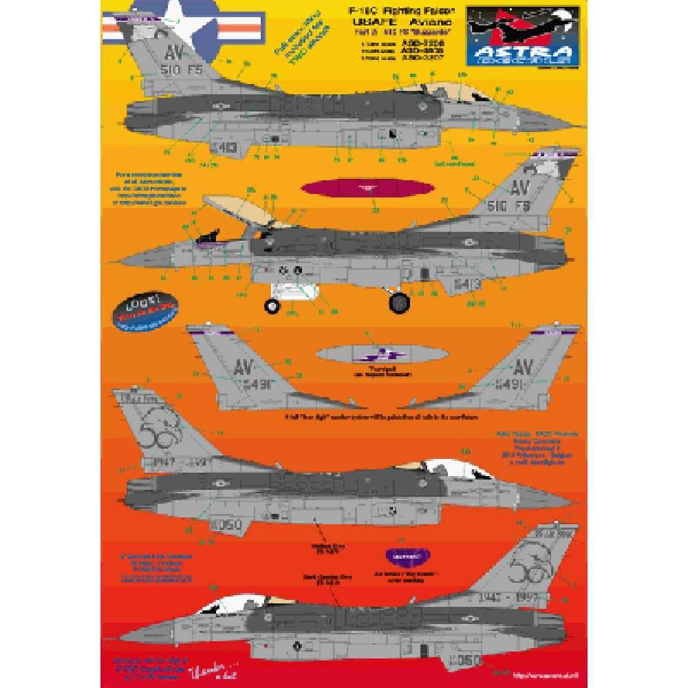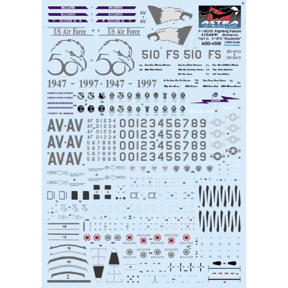 このセットではイタリアのアヴィアーノ空軍基地に駐留するアメリカ空軍の第510戦闘飛行隊で配備運用しているF-16Cのマーキングを収録しています。1994年からF-16を運用する第510飛行隊の全機のマーキングが網羅されているほか、1997年のアメリカ空軍創設50周年記念のスペシャルマーキングも収められています。1/72F-16Cをイタリア駐留部隊仕様で仕上げていただけるデカールセットです。