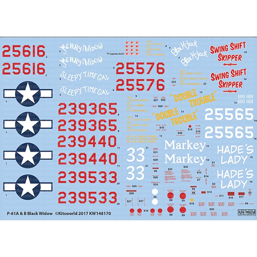 第二次大戦でアメリカが配備運用した大型の双発夜間戦闘機、ノースロップP-61の1/48スケールモデルに対応したデカールのセットです。