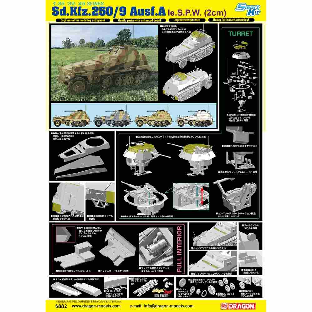 第二次世界大戦でドイツ軍が開発、運用したSd.kfz250/9装甲偵察車を1/35スケールで再現したプラスチックモデル組み立てキットです。