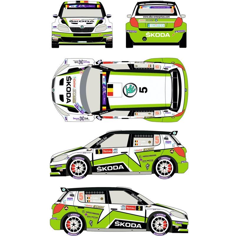 ベルキットの1/24スケール、シュコダ・ファビアS2000のモデルに対応したデカールのセットです。このセットは2013年のERC第6戦として開催されたベルギーのGeko Ypresラリーに参戦したカーナンバー5のマシンのマーキングを収録しています。