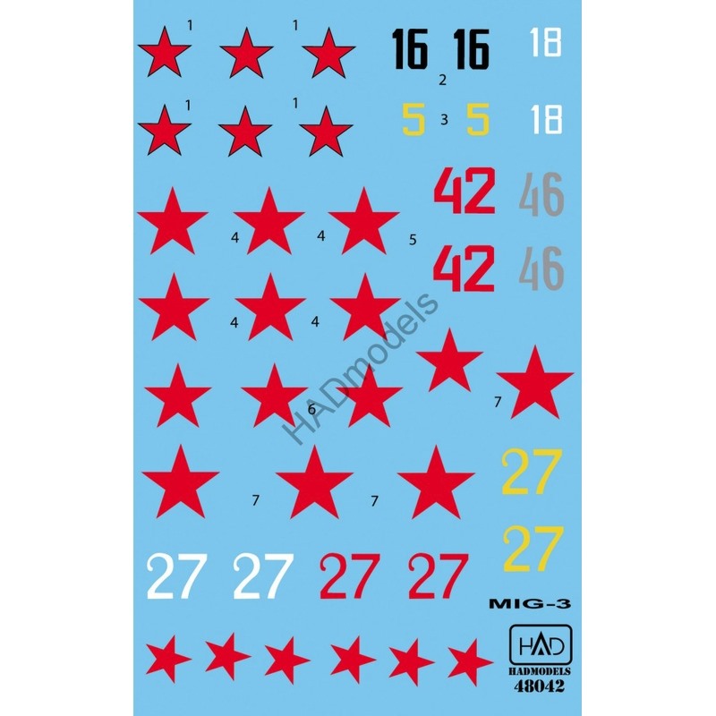 このセットは第二次大戦でソビエト軍が配備、運用した戦闘機、MiG-3のマーキングを収録しています。マーキングは5種類が収められています。1941年夏、第401戦闘機連隊所属機、1942年春、第6戦闘機連隊所属機、1942年、レニングラード近郊での第7戦闘機連隊所属機、1941/42年の冬、あるいは42年春に撮影されたホワイトに赤の42が描かれた機体、さらに、第31戦闘機連隊所属機など、魅力的なマーキングが豊富に収録されています。
