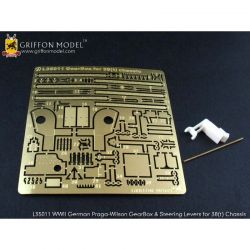 内部パーツも再現されたドラゴンの38(t)キットの車体前部に納められたギアボックスとステアリングユニットをいっそうシャープに、密度感あふれる仕上がりにディテールアップするエッチングパーツが揃っています。セットのエッチングパーツは表面の小さなリベット模様も逃さずにしっかりと表現。また、ギアボックスとステアリングユニットに繋がるレバー類もその構成をリアルに再現。レバー類の中心にあるパーツはレジンパーツで形状を再現しました。詳しい説明書もついて、確実なディテールアップをお楽しみいただけます。プラスチックパーツとは違ったシャープなディテール、金属の質感などがリアリティあふれる1ランク上の完成品を仕上げていただけるセットです。ベテランモデラーにはぜひ、利用していただきたいセットです。