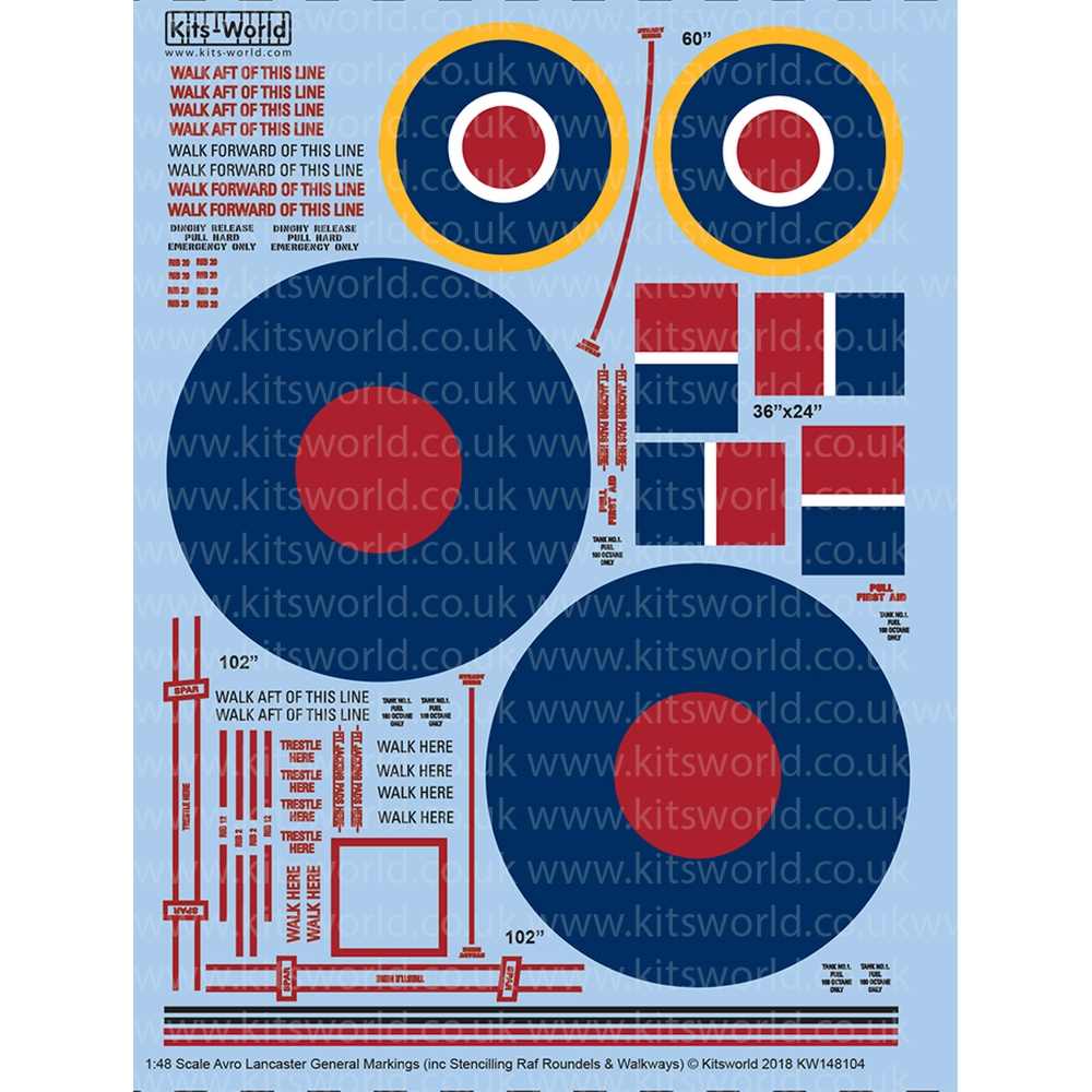 このセットでは第二次大戦中にイギリス空軍が運用したランカスターに施されたマーキングの中で、一般的に使用されるマーキングを収録しています。国籍マークのラウンデルと主翼に描かれたラインやのウォーク・ウェイ表示をセット。そのほかエマージェンシー表示や使用燃料の表示、ジャッキポイントの表示、架台設置位置表示、エンジンナセルの注意書きなどの、ステンシル類が1機分入っています。