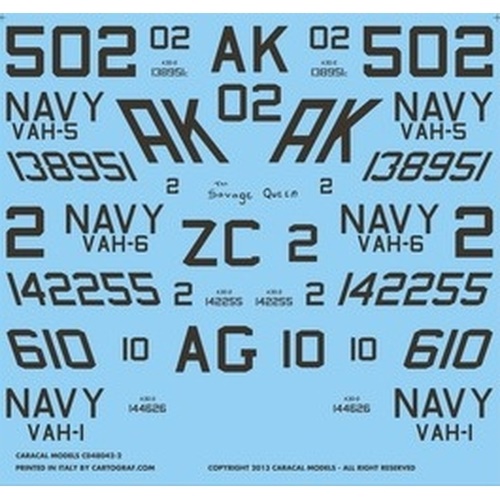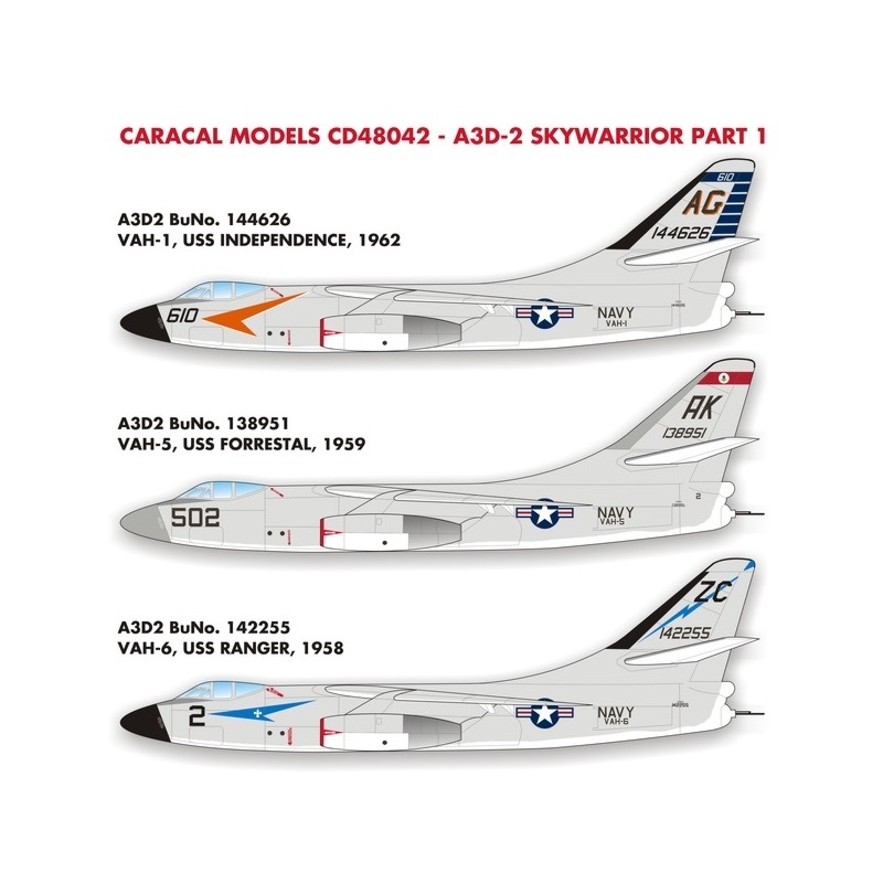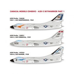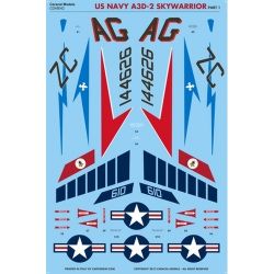 このセットはアメリカ海軍が運用していた大型の艦上攻撃機、ダグラスA3D-2スカイウォーリアのマーキングを収録しています。長く運用されたスカイウォーリアの初期の時代の中から3つの異なる飛行隊のマーキングをセレクト。また、基本的なステンシルや主翼のウォークウェイのマーキングなどは1機分を用意。