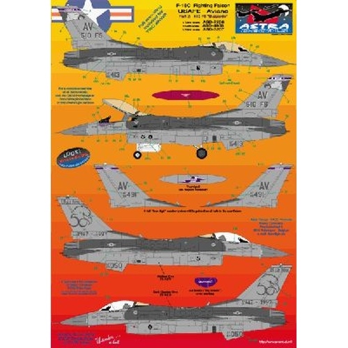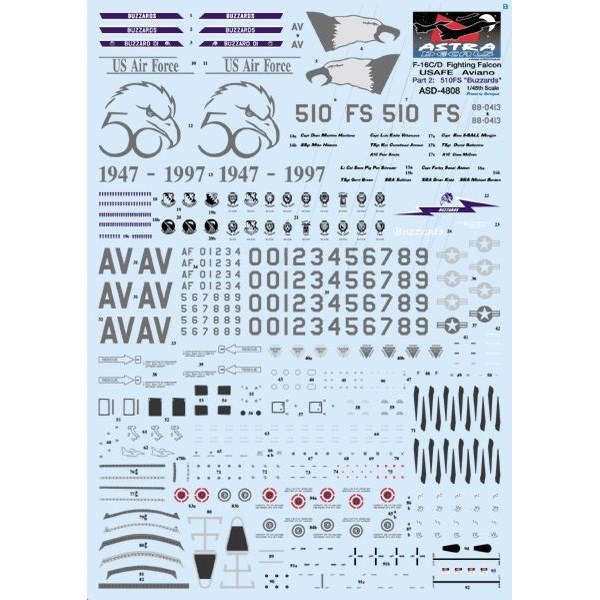 このセットではイタリアのアヴィアーノ空軍基地に駐留するアメリカ空軍の第510戦闘飛行隊で配備運用しているF-16Cのマーキングを収録しています。1994年からF-16を運用する第510飛行隊の全機のマーキングが網羅されているほか、1997年のアメリカ空軍創設50周年記念のスペシャルマーキングも収められています。1/48F-16Cをイタリア駐留部隊仕様で仕上げていただけるデカールセットです。