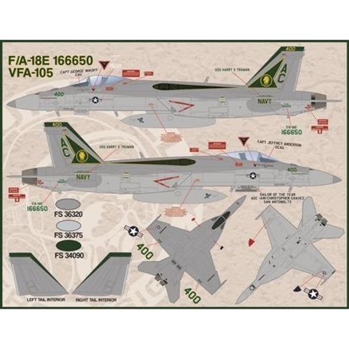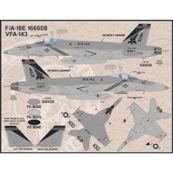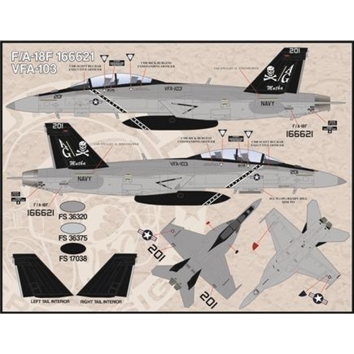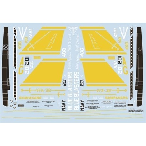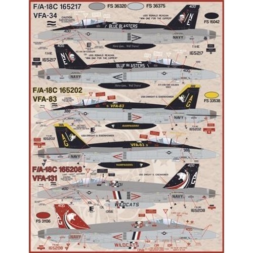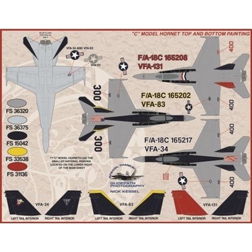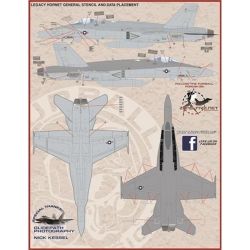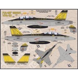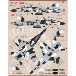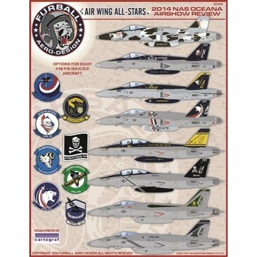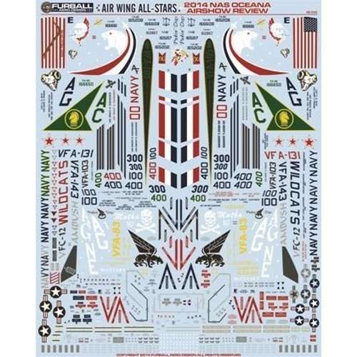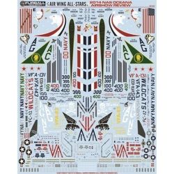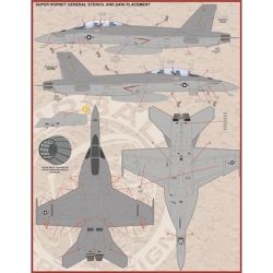 このセットでは2014年に開催されたNASオシアナエアショーに参加したアメリカ海軍のF/A‐18の中から専用のカラーリング、マーキングが施されて人気の航空団司令官搭乗機、CAG機と飛行隊長機、CO機、合わせて8機のマーキングをセレクト。F/A-18A/CレガシーホーネットとF/A-18E/Fスーパーホーネットのマーキング各4機種ずつを収録しています。このセットではレガシーホーネットとスーパーホーネットのそれぞれ各1機分が製作可能なステンシルやデータのマークが用意されています。