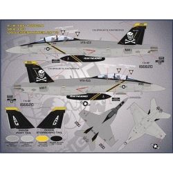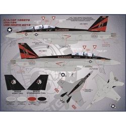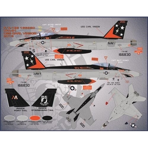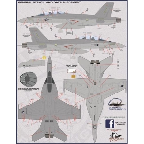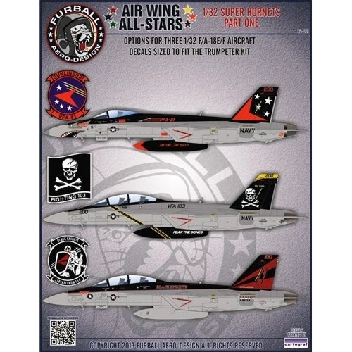 このセットではF/A-18Eの機体用に1タイプ、F/A-18Fの機体用に2タイプの計3種のマーキングをセレクトして収録しています。専用のカラーリング、マーキングが施されて人気の航空団司令官搭乗機、CAG機から3機を選んでマーキングを収録しています。アカデミーの1/32スケール、スーパーホーネットのキットに対応し、このセットにはステンシルやデータのマーク、1機分も用意されています。