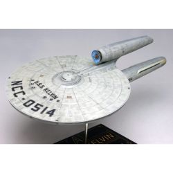 惑星連邦宇宙艦隊が23世紀に運用していた宇宙艦がU.S.S.ケルヴィンです。U.S.S.エンタープライズの船長、ジェイムス・T・カークの父親、ジョージ・カーク少佐が副長を務めていた艦として知られています。ケルヴィン型の1艦で円盤部の上下にそれぞれ1本ずつ、上部に推進部(第二船体)と下部にワープナセルがレイアウトされているのが特徴です。フェイザー・ビームを発射するフェイザー・タレットと光子魚雷ランチャーを武装として装備。乗員は約800名とされています。4つの重水素融合炉から動力を得るインパルスエンジンを搭載していました。外観はライアン・チャーチが、内装はジェイムス・クラインが担当。映画では謎の巨大宇宙船、ナラーダが出現。そこから攻撃を受けて損傷したケルヴィンは乗員を退避させたのち、ナラーダへ体当たりを敢行して自沈したのです。