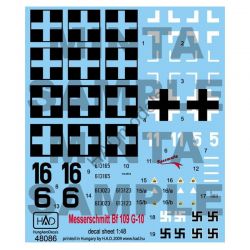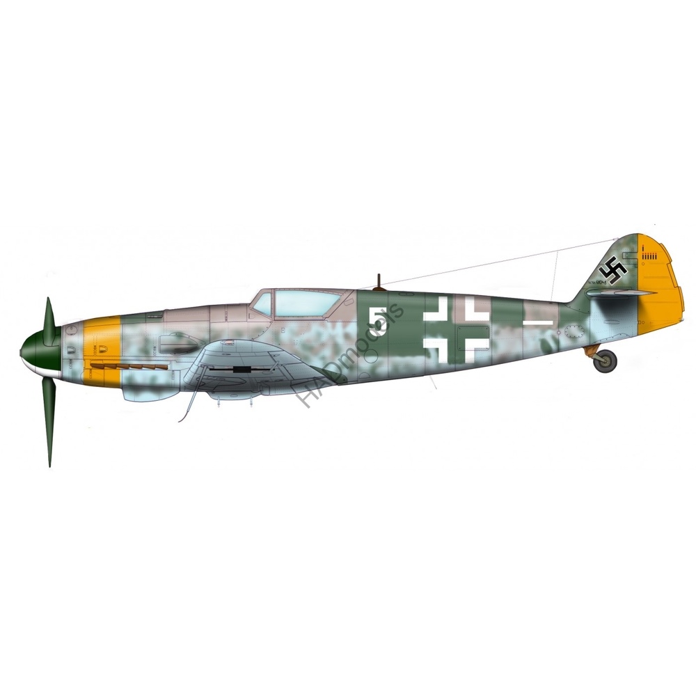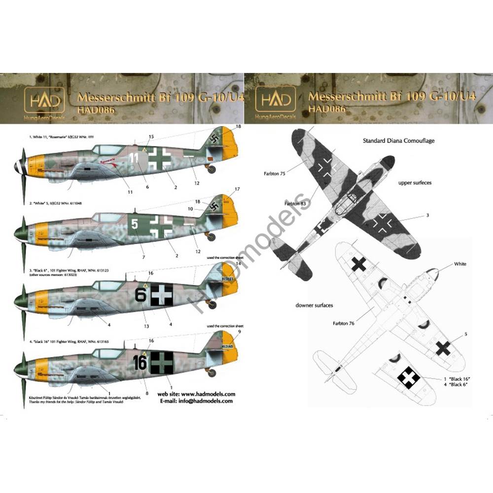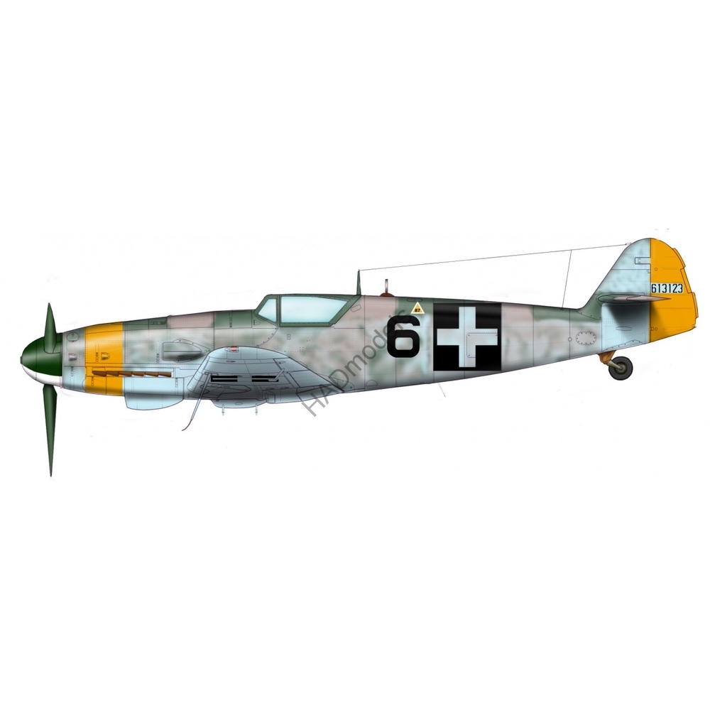 このセットは第二次大戦でソビエト軍と戦ったハンガリー空軍のメッサーシュミットBf109 G-10/U4のマーキングを収録しています。マーキングは4種類が収められています。ハンガリー空軍の第101戦闘航空団所属機、ブラック6とブラック16の2機に加えてドイツ空軍の第52戦闘航空団所属機、ホワイト5とホワイト11の2機の4種。どれもノーズとラダーのイエローの塗分けが目を引きます。