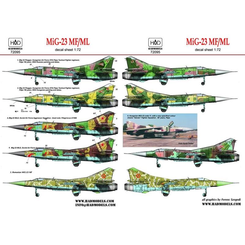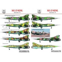 このセットは傑作戦闘機として共産圏諸国に多数配備されたMiG-23のマーキングを収録しています。ハンガリー空軍、ロシア空軍アグレッサー機、ルーマニア空軍の各機体から5種類のマーキングをセレクトしています。ハンガリー空軍機のマーキングとロシア空軍アグレッサー機のマーキングが各2種、ルーマニア空軍機のマーキングが1種類の計5種です。独特な迷彩カラーの塗装と合わせて、カラフルなマーキングが見逃せません。