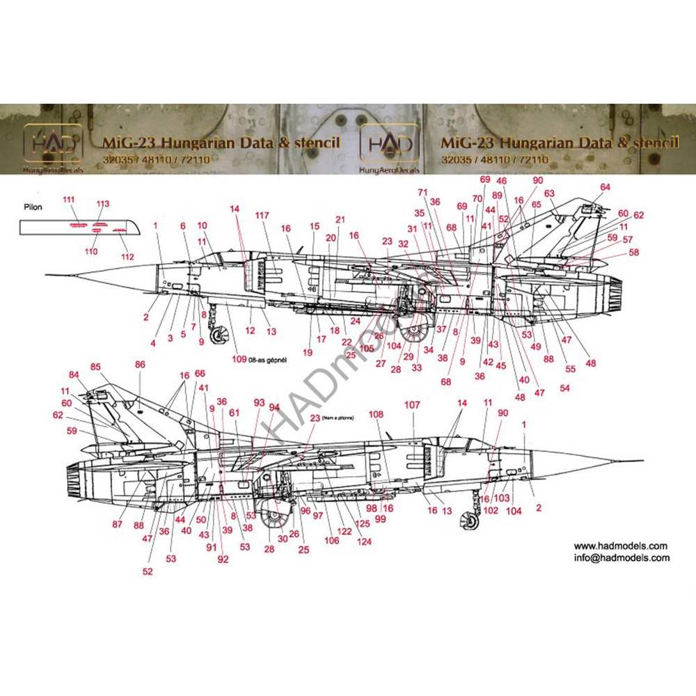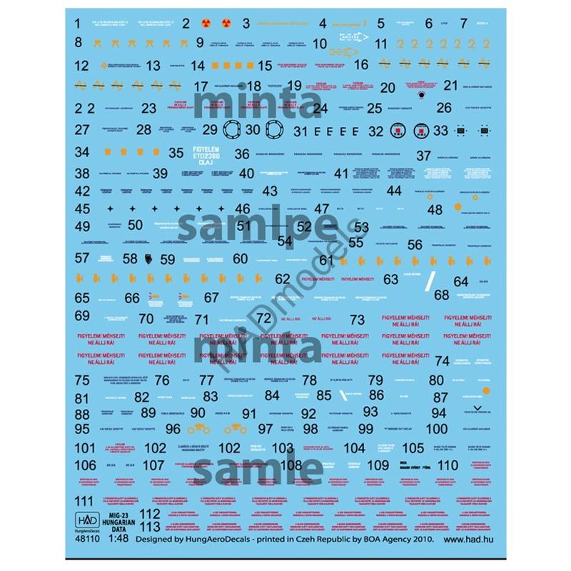 このセットはハンガリー空軍が装備したMiG-23の機体各所に記されていた注意書きなどのステンシル(コーションマーク)を詳細に収録しています。マーキングは120種類以上を再現。貼り付けの位置は丁寧に指示が書き込まれたイラストが用意されています。手持ちのモデルをよりリアルに仕上がるのに欠かせないデカールです。