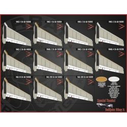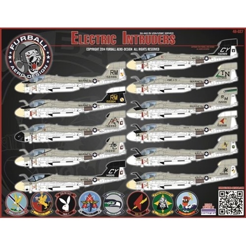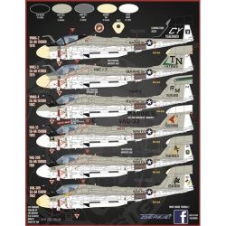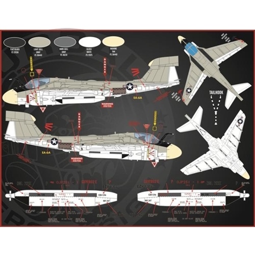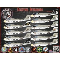 このセットでは1960年代に開発され、アメリカの海軍と海兵隊により90年代まで運用した電子戦機、EA6-Aエレクトリック・イントルーダーの中から11機のマーキングを収録しています。マークは高品質でおなじみのイタリアのカルトグラフ社製。マークの色合いもフェデラル・スタンダード・ナンバーに合わせて調色されています。このセットで2機分が製作可能なステンシルや国籍マークが用意されています。各マークの貼り付けにはわかりやすく解説した5ページのカラーの説明書も付属。その中から選んであなたの手元のイントルーダーを仕上げてください。