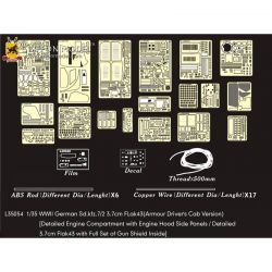 第二次大戦でドイツ軍が開発した8トンハーフトラックは兵員輸送タイプを基本に、各種火砲を搭載した自走砲タイプも多数開発されました。そのひとつ、3.7cm対空機関砲Flak43を搭載し、装甲キャビンを装備したSd.Kfz.7/2を再現したサイバーホビーのキットをさらにディテールアップ。セットには8トンハーフトラックの荷台に搭載された迫力ある3.7cm対空機関砲Flak43の繊細な仕上げを演出するエッチングパーツや車体各部のディテールを高めるパーツを収録。3.7cm砲は砲弾装填トレーや射撃手のガンサイト、フットペダルなど、細部のパーツにいたるまで用意。シールド類は戦闘中の展開状態と移動中の閉じた状態を選んで組み立て可能です。また、車体もフロントのラジエターメッシュをはじめクーリング用スリットが再現されたボンネットサイドパネル、さらに、エンジンのディテールアップパーツも入っています。セットには詳しい説明書もついて、確実なディテールアップをお楽しみいただけます。プラスチックパーツとは違ったシャープなディテールがリアリティあふれる1ランク上の完成品を仕上げていただけるセットです。ベテランモデラーにはぜひ、利用していただきたいセットです。