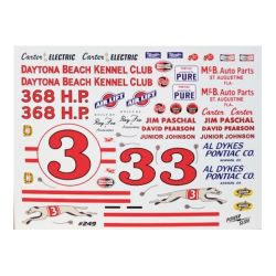 このデカールはメビウスモデルの1961年型ポンティアック・ベンチュラのキットに対応したセットです。1961年に数多くの勝利を記録しているデビッド・ピアソンのほか、ジュニア・ジョンソン、ジム・パスカルがドライブしたデイトナ・ケンネルクラブのカーナンバー3のマシンのマーキングを収録しています。