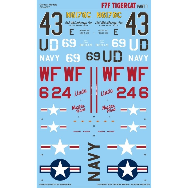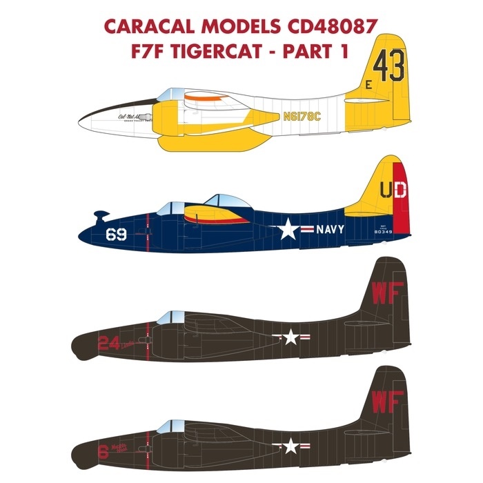 このセットはアメリカ海軍最後のレシプロ戦闘機として知られるグラマンF7Fタイガーキャットのマーキングを収録しています。中でも退役後に民間に払い下げられ火災消防機として活躍した機体や夜間戦闘機型、さらに、ドローン母機タイプの4種のマーキングをフィーチャー。F7F2-Ðのドローン母機タイプ用を使用、製作する場合はキット本体に改造が必要となります。